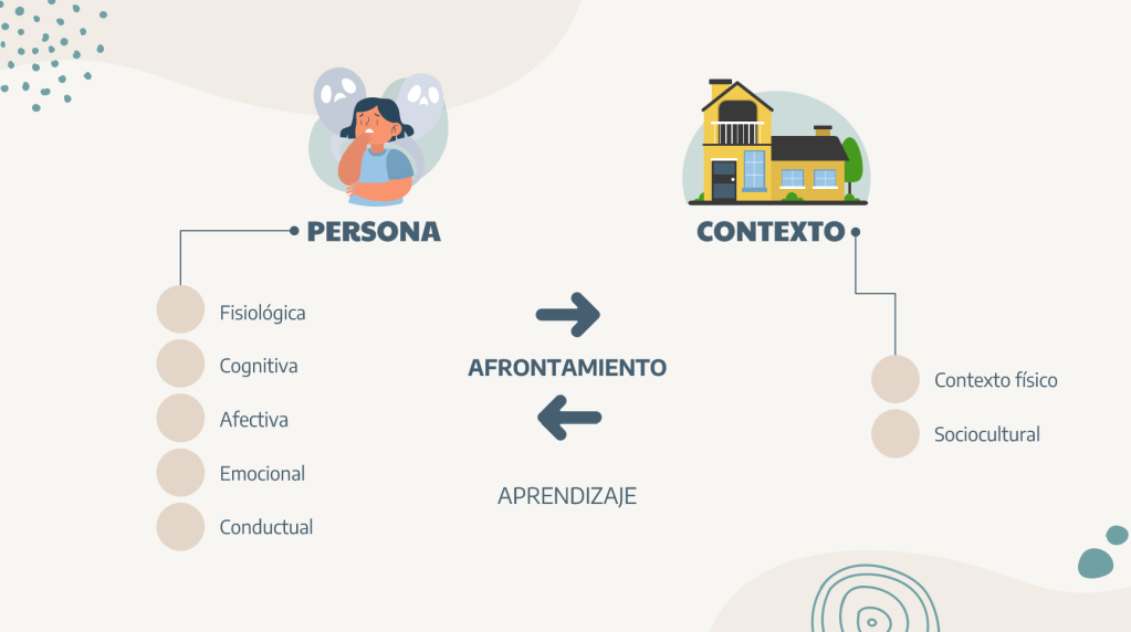 La variable que interactúa entre la persona y el contexto es el afrontamiento o coping, como se enfrenta la persona antes, durante y después de cualquier situación del día a día o que sean desafiantes.