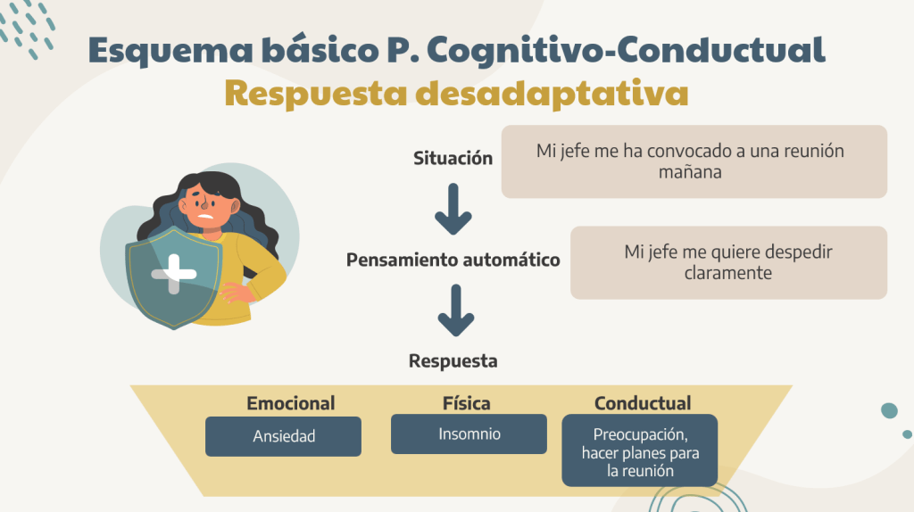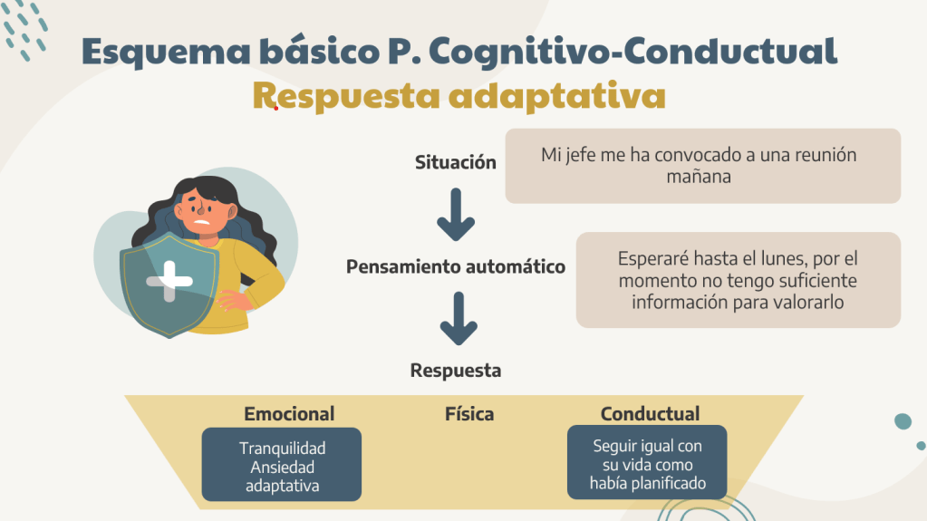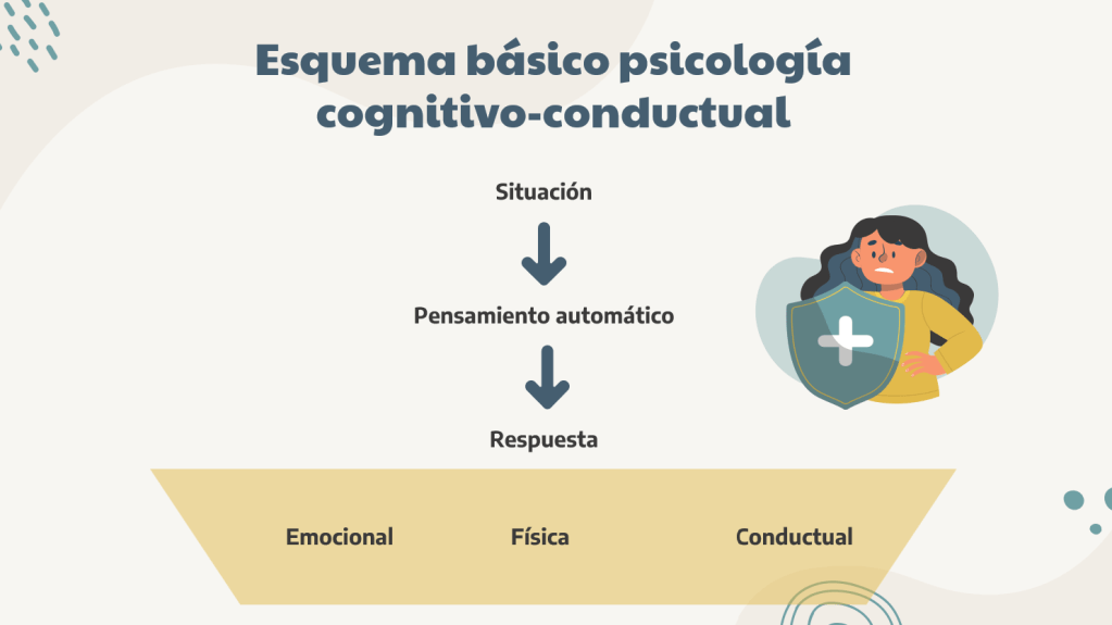 Por ejemplo explicar el Esquema básico psicología cognitivo-conductual y ponemos un ejemplo claro.