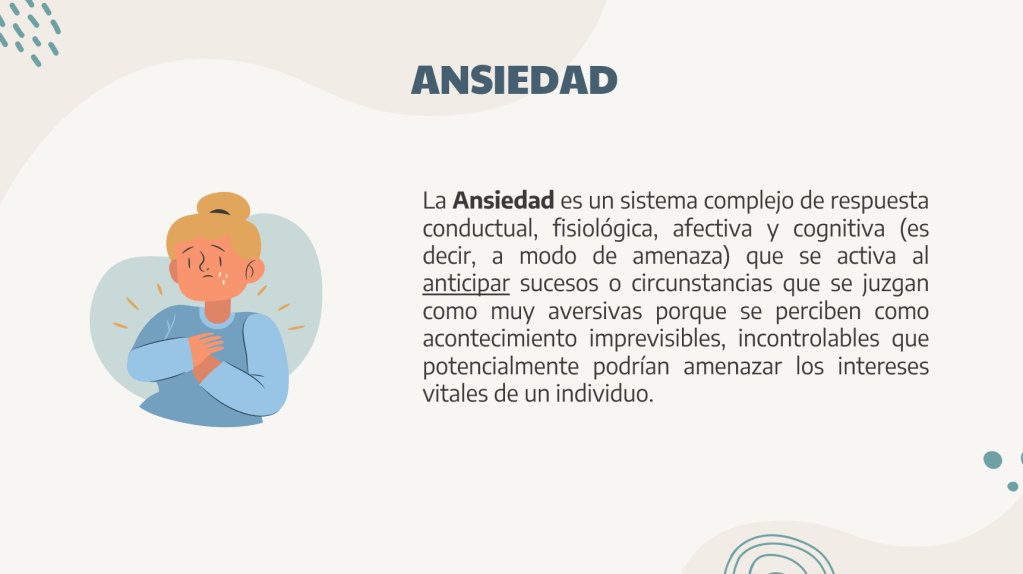 La Ansiedad es un sistema complejo de respuesta conductual, fisiológica, afectiva y cognitiva (es decir, a modo de amenaza) que se activa al anticipar sucesos o circunstancias que se juzgan como muy aversivas porque se perciben como acontecimiento imprevisibles, incontrolables que potencialmente podrían amenazar los intereses vitales de un individuo.
