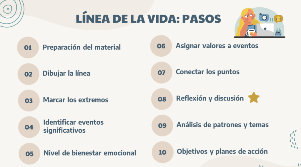- Reflexión y discusión: Después de marcar los eventos, se reflexiona sobre ellos. Se considera cómo estos eventos han impactado la vida de la persona, cómo se sintió en esos momentos, y qué aprendizajes se pueden extraer. Si la técnica se realiza con la guía de un terapeuta o coach, este momento incluirá una discusión profunda sobre las observaciones y sentimientos que surgen.