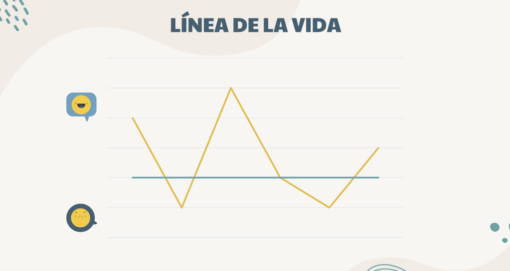- Eje Vertical – Nivel de bienestar emocional: Además del eje horizontal que representa el tiempo (desde el nacimiento hasta el presente), puedes dibujar un eje vertical que represente niveles de felicidad o bienestar emocional. El centro del eje puede representar un estado neutral, con la parte superior indicando momentos de mayor felicidad y la parte inferior momentos de tristeza o desafío.