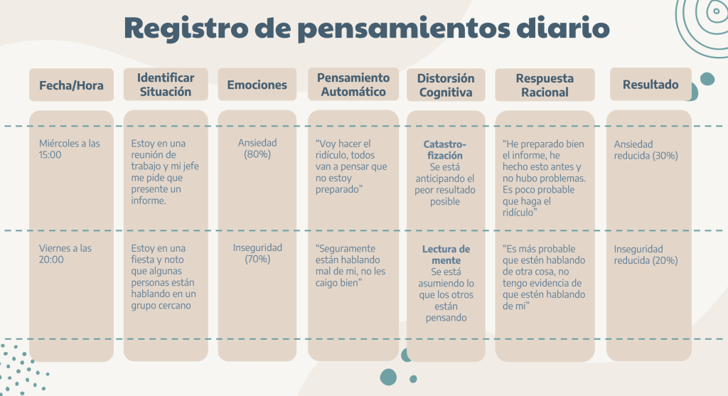 - Detectar temas comunes en los pensamientos automáticos: Observa patrones repetitivos de pensamiento, emociones y conductas en diferentes situaciones, lo que ayuda a revelar esquemas subyacentes o supuestos básicos activados por estas situaciones.